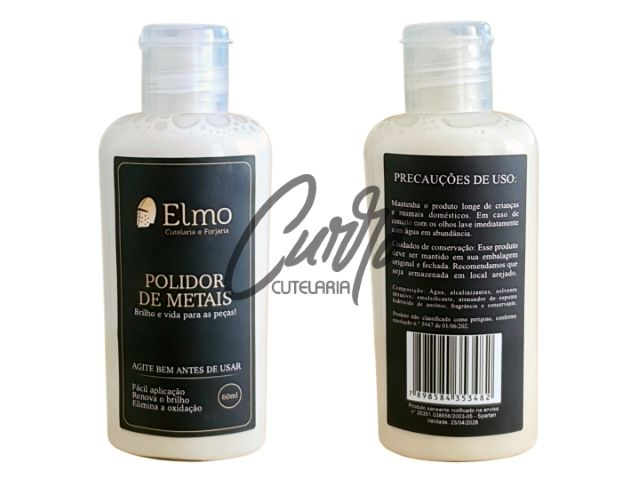 2 Unidades Frascos Polidor de Metais Elmo 60ml (120ml totais) – indicado para facas, joias, ouro, prata, alpaca, latão, alumínio e até moedas antigas. Desenvolvido para restaurar brilho e conservar peças, garantindo acabamento de qualidade.