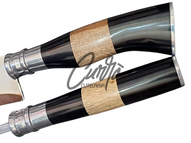 Conjunto BBQ Faca Chaira Elmo Cabo Resina Tipo Chifre Madeira 9"