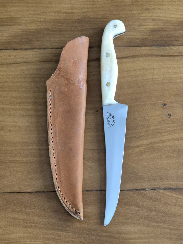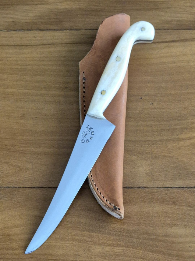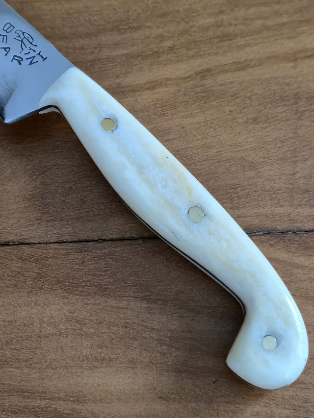 Faca compacta, leve e funcional. Ideal para cozinha, uso geral e atividades ao ar livre. Lâmina em aço inox 420C, com boa retenção de fio e fácil afiação. Cabo em osso bovino com pinos em latão. Acompanha bainha em couro legítimo.
