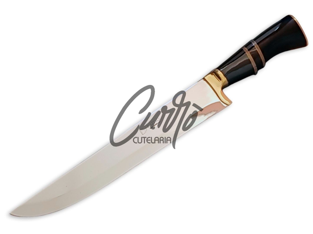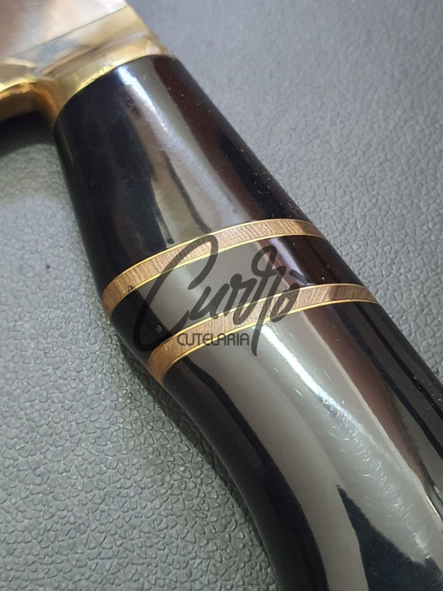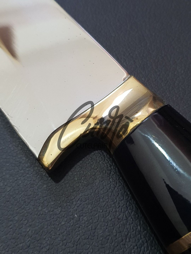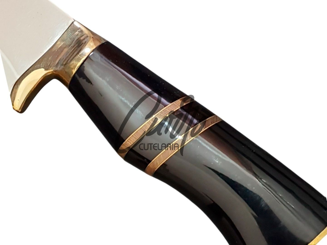A Faca Artesanal Elmo une tradição e sofisticação em um design robusto. Sua lâmina garante cortes precisos e alta durabilidade, enquanto o cabo, com detalhes refinados, proporciona conforto e elegância.