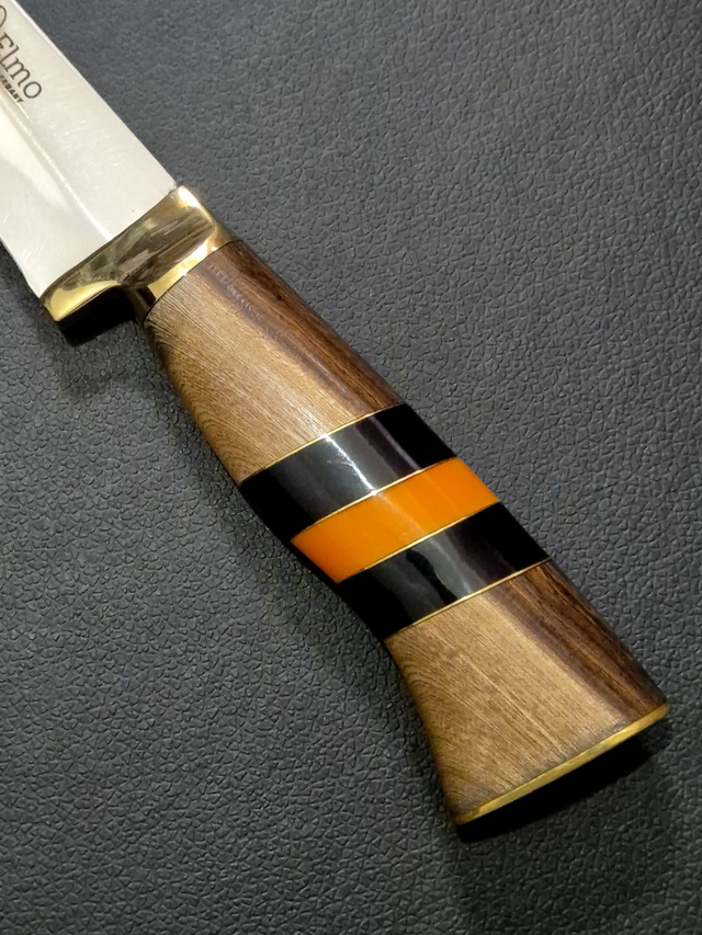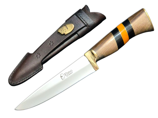 A Faca Artesanal Elmo une tradição e sofisticação em um design robusto. Sua lâmina garante cortes precisos e alta durabilidade, enquanto o cabo, com detalhes refinados, proporciona conforto e elegância.