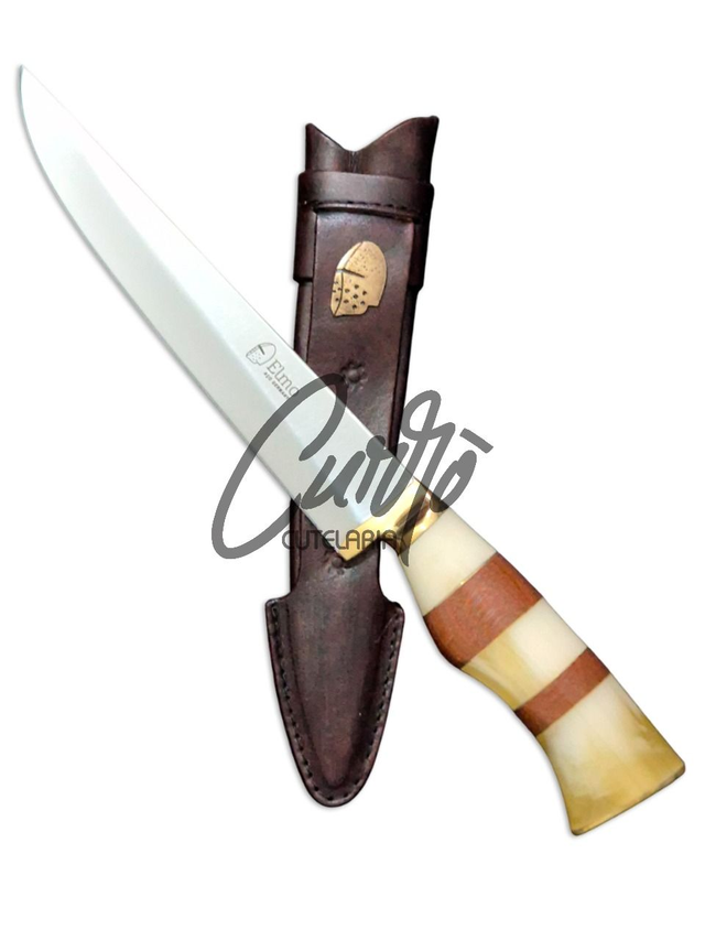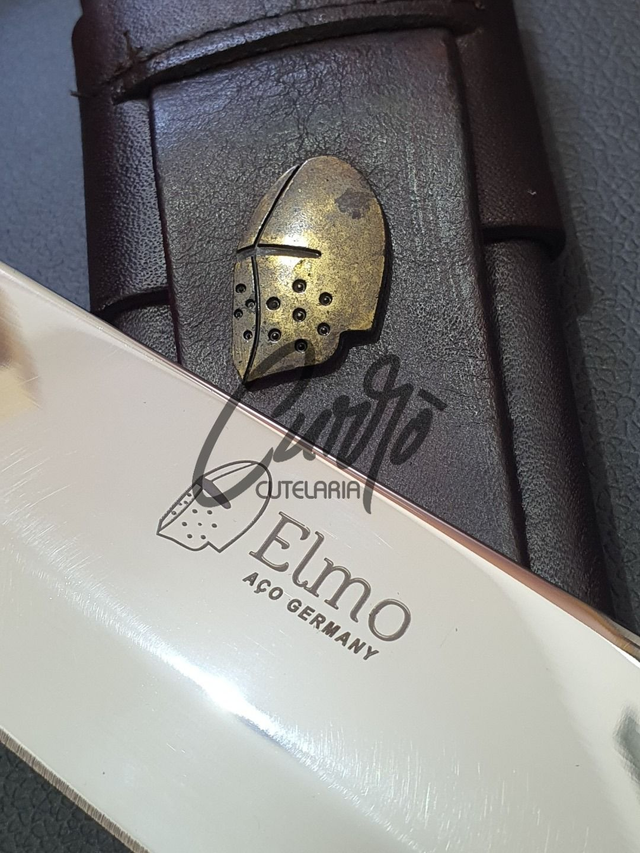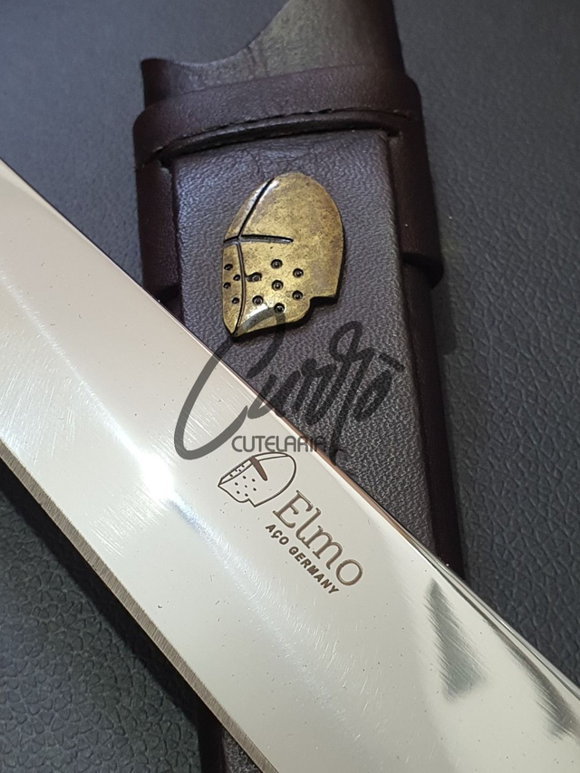 A Faca Artesanal Elmo une tradição e sofisticação em um design robusto. Sua lâmina garante cortes precisos e alta durabilidade, enquanto o cabo, com detalhes refinados, proporciona conforto e elegância.