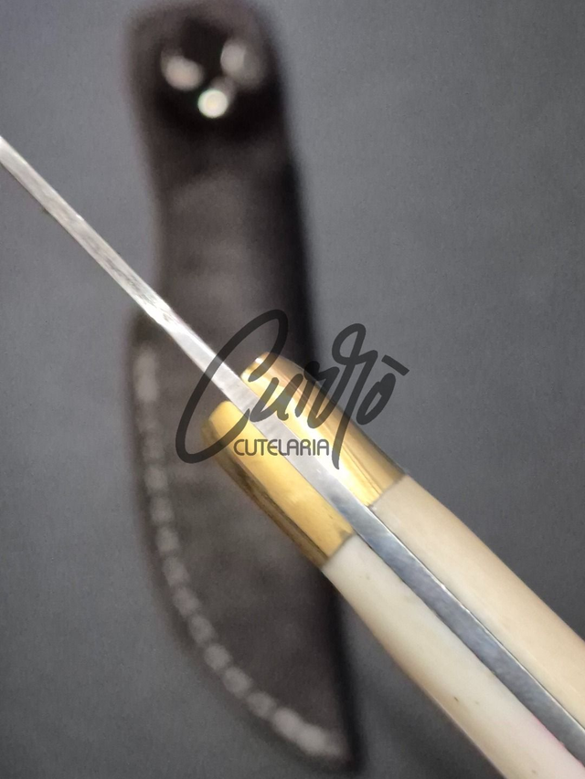 Peça artesanal da Cutelaria Bearzi, com lâmina em aço inox de alto desempenho e cabo em osso branco natural. Compacta, elegante e robusta, ideal para uso diário ou coleção.