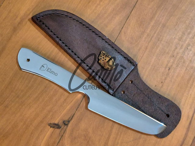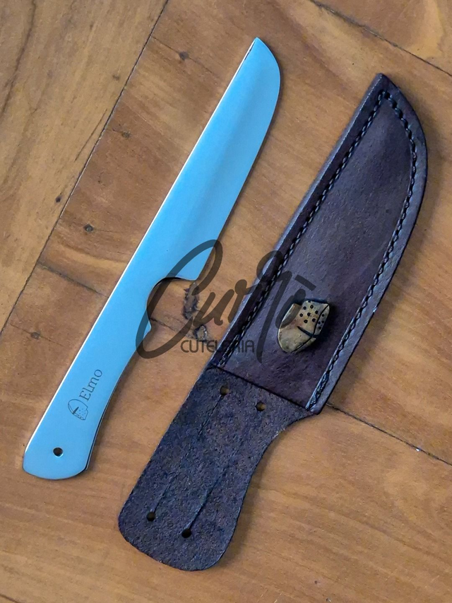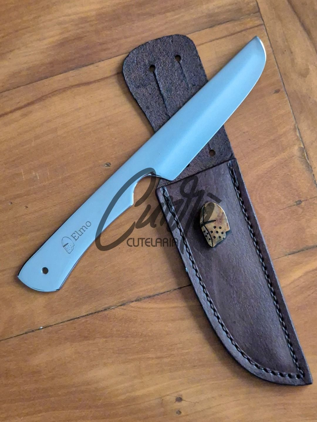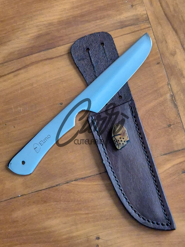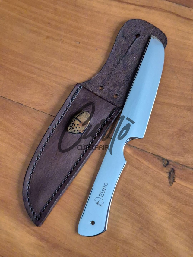 A Faca Castradeira Elmo é compacta, robusta e versátil, ideal para uso ao ar livre ou na cozinha. Feita em aço inoxidável alemão, oferece alta durabilidade e resistência à corrosão. Sua lâmina afiada de 11 cm e 2 mm de espessura garante cortes precisos. A construção inteiriça proporciona estabilidade e segurança, enquanto a bainha em couro legítimo protege e facilita o transporte.
