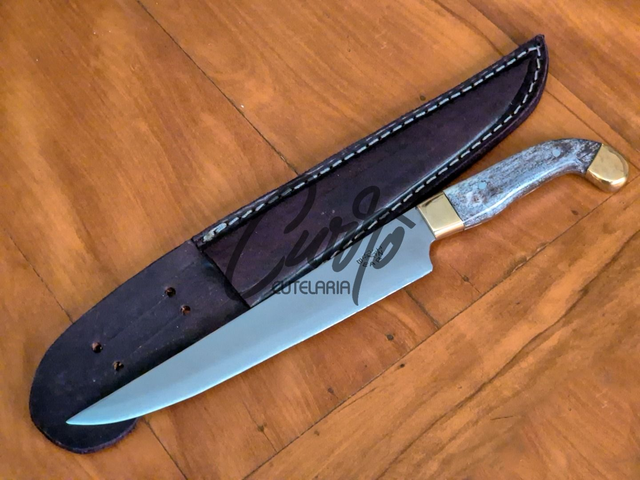 A tradicional Sorocabana Bearzi é sinônimo de corte, beleza e história. Lâmina em inox 420C, fácil de afiar e resistente. Cabo em osso tingido, guarda e pomo em latão, visual clássico e marcante. Acompanha bainha de couro feita sob medida. Ideal para churrasco, uso geral ou coleção.