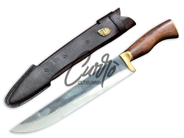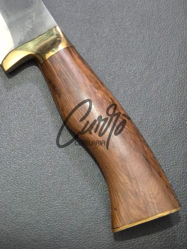 Aço inox de alta durabilidade, lâmina de 3 mm e acabamento brut forge. Cabo em madeira nobre com guarda e pomo em latão, unindo elegância e firmeza no manuseio. Acompanha bainha em couro legítimo.