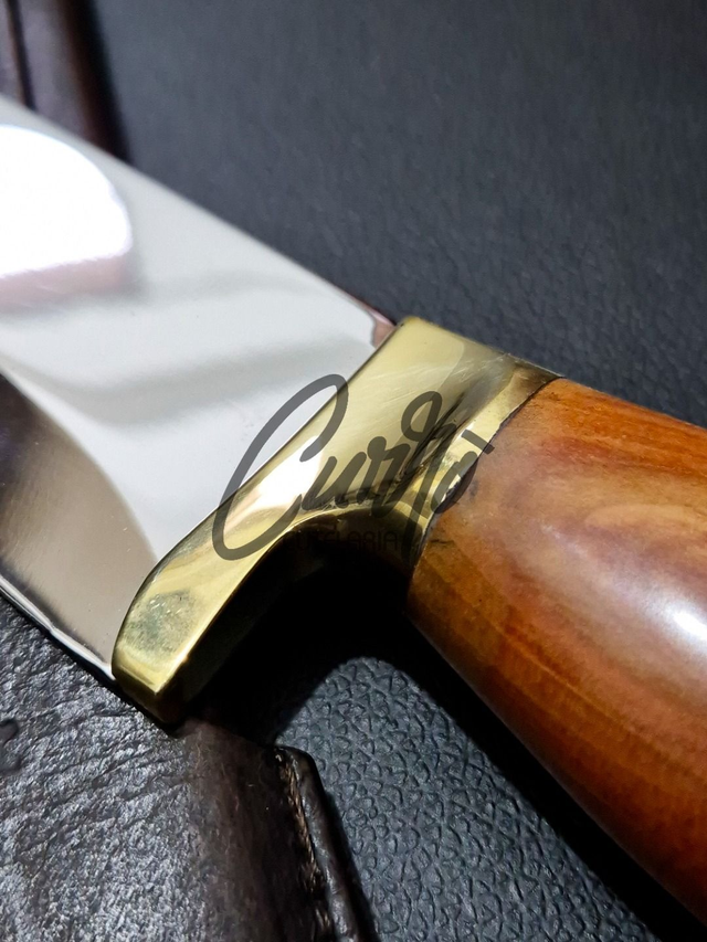 Lave após o uso e guarde em local seco, dentro da bainha de couro, para preservar a lâmina e o cabo. Evite umidade e produtos químicos que possam danificar o material.