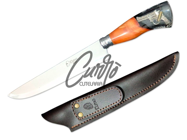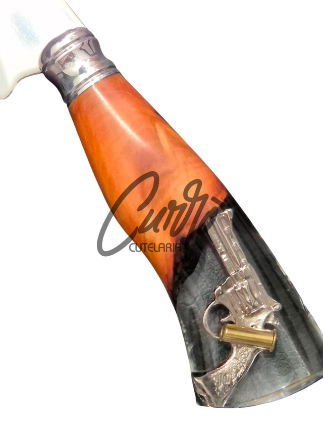 Peça elegante e funcional, ideal para o dia a dia no churrasco. Lâmina em aço inox 420C de 2mm, leve e precisa. Cabo híbrido com madeira, resina e miniatura de revólver. Guarda em alumínio e bainha.