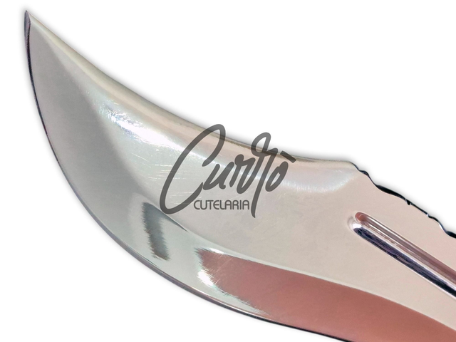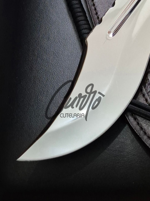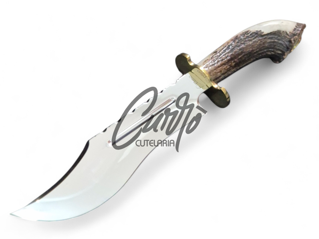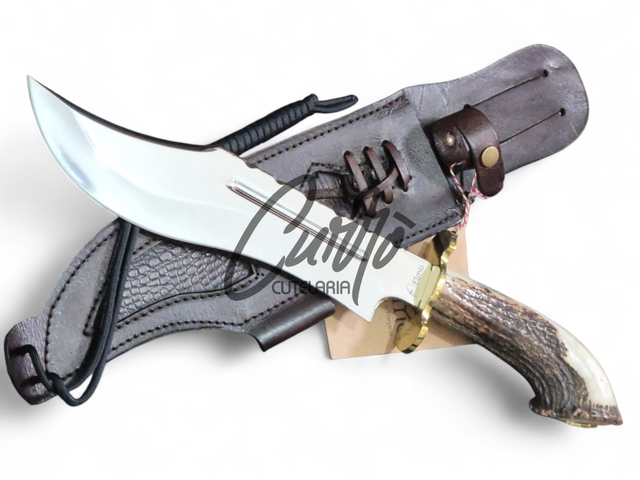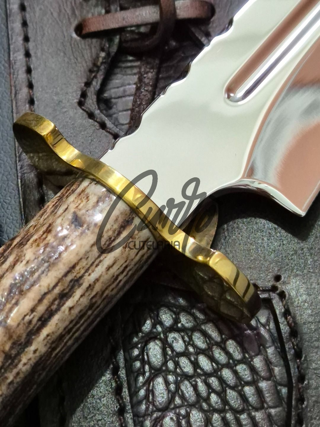 A Faca Bowie Javalizeira é forjada em aço inox de alta qualidade, com lâmina de 5mm de espessura, garantindo resistência e durabilidade excepcionais. Seu cabo, esculpido em chifre de cervo natural, oferece uma pegada confortável e estética rústica. A guarda e pomo em latão adicionam sofisticação, enquanto a bainha em couro legítimo proporciona praticidade e estilo.