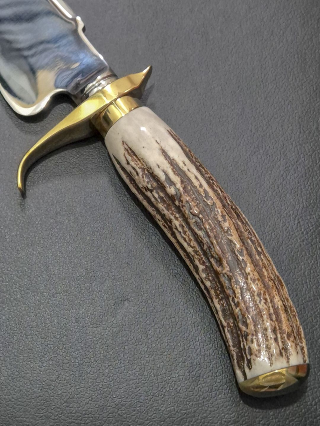 - Cabo em chifre de cervo natural, oferecendo estética rústica e boa aderência