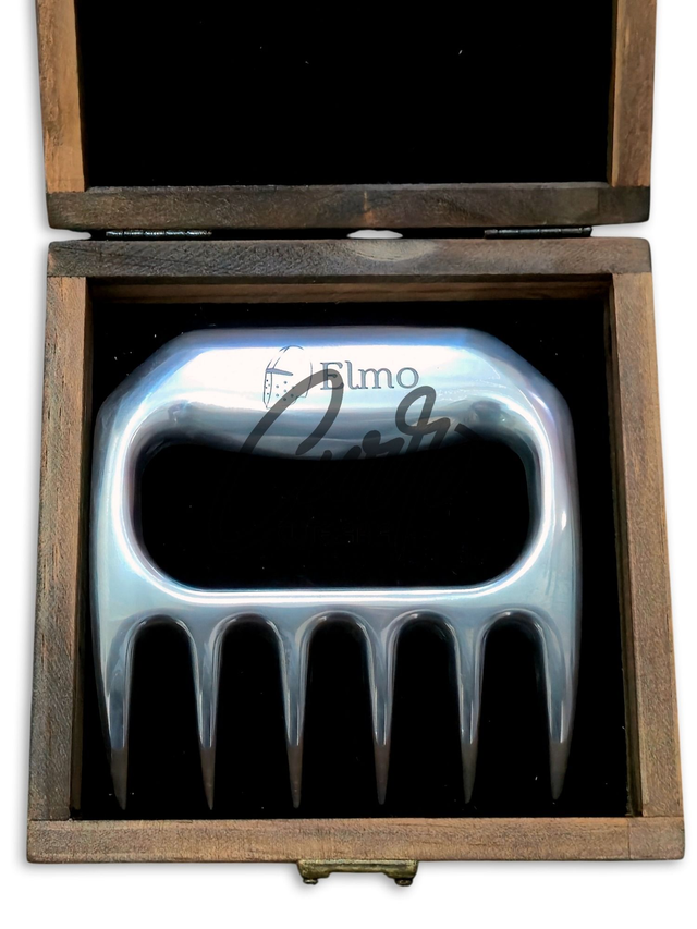 Com dentes afiados e pegada anatômica, é perfeita para segurar, cortar e desfiar carnes de forma precisa e segura. Acompanha caixa em madeira para armazenamento e apresentação, tornando-se também uma peça diferenciada para colecionadores.
